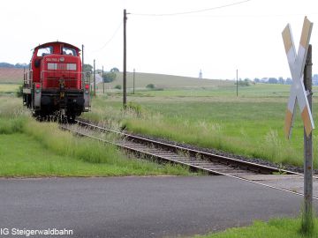Nach der Zustellung der ersten 8 Wagen im PA Schwarz Bewehrungstechnik fährt die Lok zurück nach Pettstadt um den 2. Zugteil zu holen.