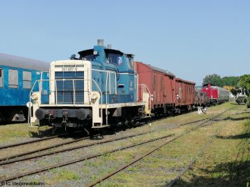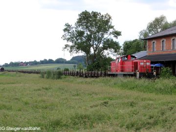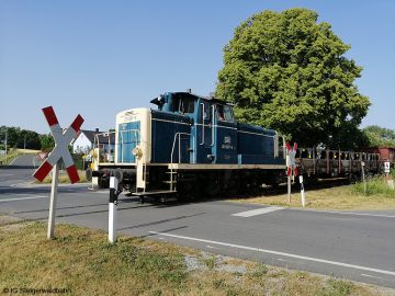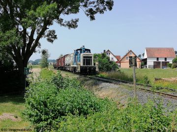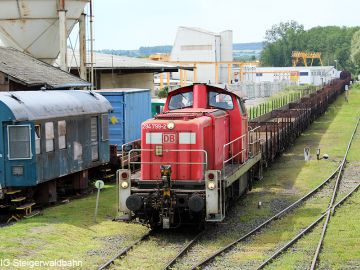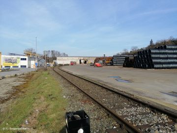 Nach der Zustellung der ersten 8 Wagen im PA Schwarz Bewehrungstechnik fährt die Lok zurück nach Pettstadt um den 2. Zugteil zu holen.
