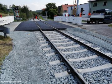 Im Rahmen der geplanten Erneuerung der Staatsstraße im Bereich Volkersdorf - Wachenroth im August/September 2023 wurde auch die Fahrbahn der beiden, dort befindlichen, technisch gesicherten Bahnübergänge grundhaft erneuert.